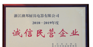 近日,浙江潮邦廚具電器有限公司獲得浙江省嘉興市2018~2019年度誠信民營企業、海寧市2019年度誠信民營企業榮譽證書。 獲此殊榮
