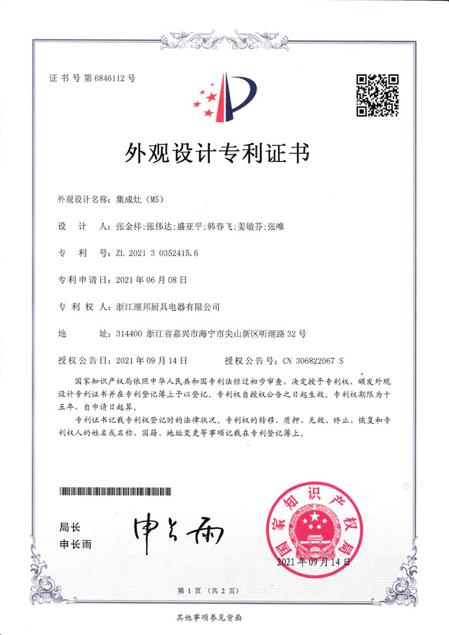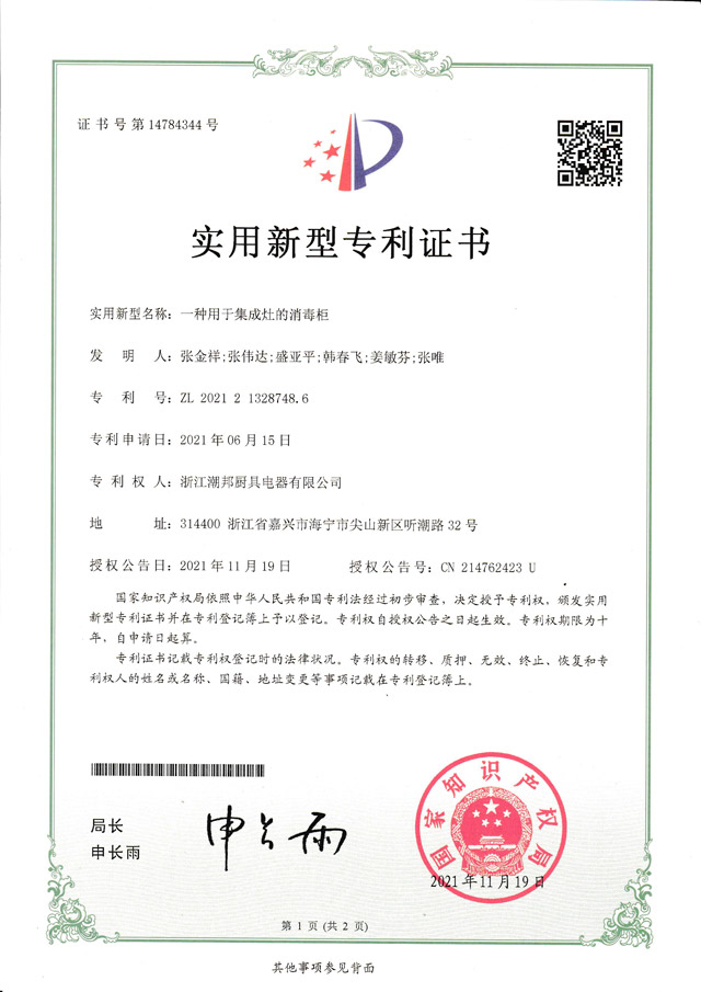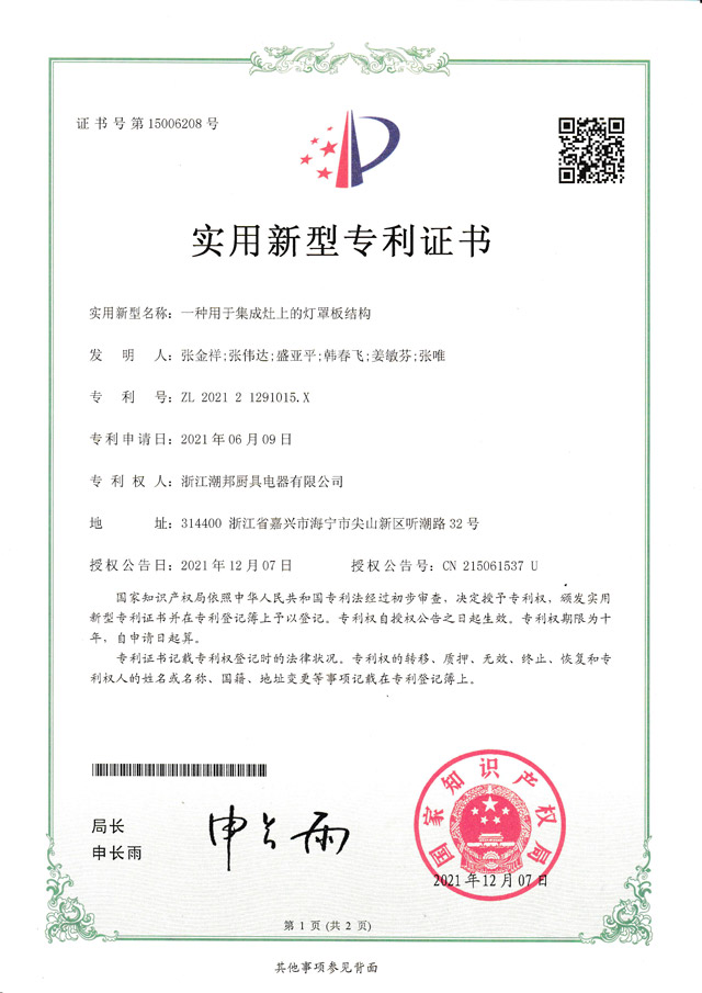 2009年至今,潮邦獲得近百項發明專利和證書,同時獲得國內眾多獎項,穩居廚電行業翹楚,開創中國集成廚房新時代。